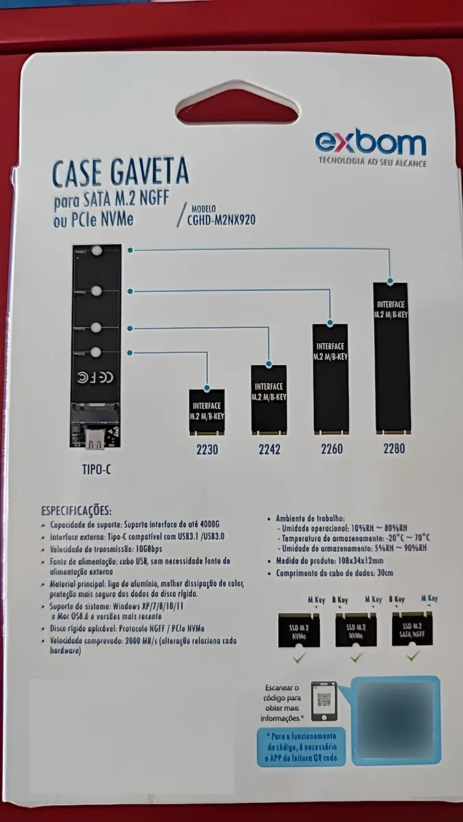 O Case Externo para SSD M2 NGFF e NVMe é projetado para oferecer suporte a interfaces de até 4000G e conta com uma interface externa Tipo-C, compatível com USB 3.1 e 3.0, garantindo velocidades de transmissão de até 10Gbps. Alimentado via cabo USB, o case é fabricado em liga de alumínio, o que melhora a dissipação de calor e protege seus dados com segurança. É compatível com sistemas Windows XP/7/8/10/11 e Mac OS 8.6 e superiores, suportando discos rígidos com protocolo NGFF/PCIe NVMe. Com uma velocidade comprovada de até 2000MB/s, o cabo de dados de 30cm proporciona praticidade e eficiência no uso.